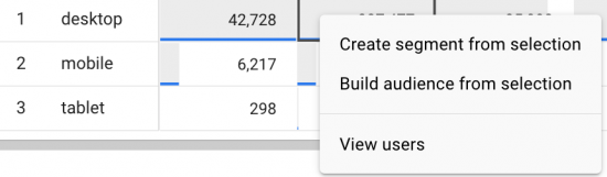 As you can see on the screenshot, the table is interactive. You can restrict or exclude a section of the table with a right mouse click. A segment or audience can also be created at this point. Thanks to the visible data reference, the segment can be understood visually. A step towards further analysis is the menu item "View users," which takes you to the User explorer of the respective data point.