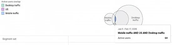 The interactive diagram provides information about the correlation between the selected segments. At the user or event level, the data selection is broken down in the table below. All combinations of the selected segments are shown, as well as the individual segments separately.