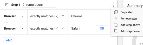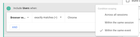 At this point, it’s already quite easy to make customizations. For example, while debugging it can be helpful to focus on a certain browser when a specific event happens on the website. The segment can then be adapted to the extent that it only includes a specific browser version within the same event. You can then modify the segment and even select the condition scoping.