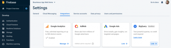 From here, we will set up the export within Firebase by navigating back to Project Settings > Integrations. On the BigQuery card, click Link.