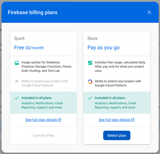 Finally, it’s important to note that you’ll need to upgrade to a Blaze plan within Firebase. The Google documentation doesn’t call out this step, but it’s required, even if you intend to stay within the sandbox limits.