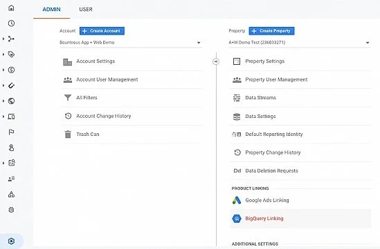 To begin, navigate to the admin section of your Google Analytics 4 property. Within the Property settings, you’ll find "BigQuery Linking" available under the Product Linking section.