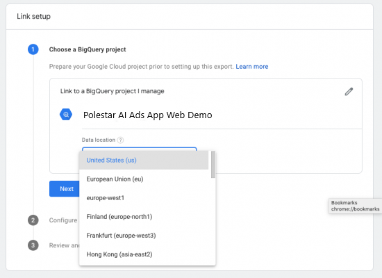 From here, you’ll see several configuration options. By default, all apps in your project are linked to BigQuery and any apps that you later add to the project are automatically linked to BigQuery, as well.