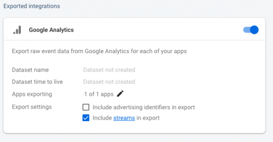 There are (2) export settings available, including enabling advertising identifiers or streams in your export. You may also choose to include streams in the export to switch to control the export of web streams from the associated Firebase project and the associated Analytics App + Web (Google Analytics 4) property.